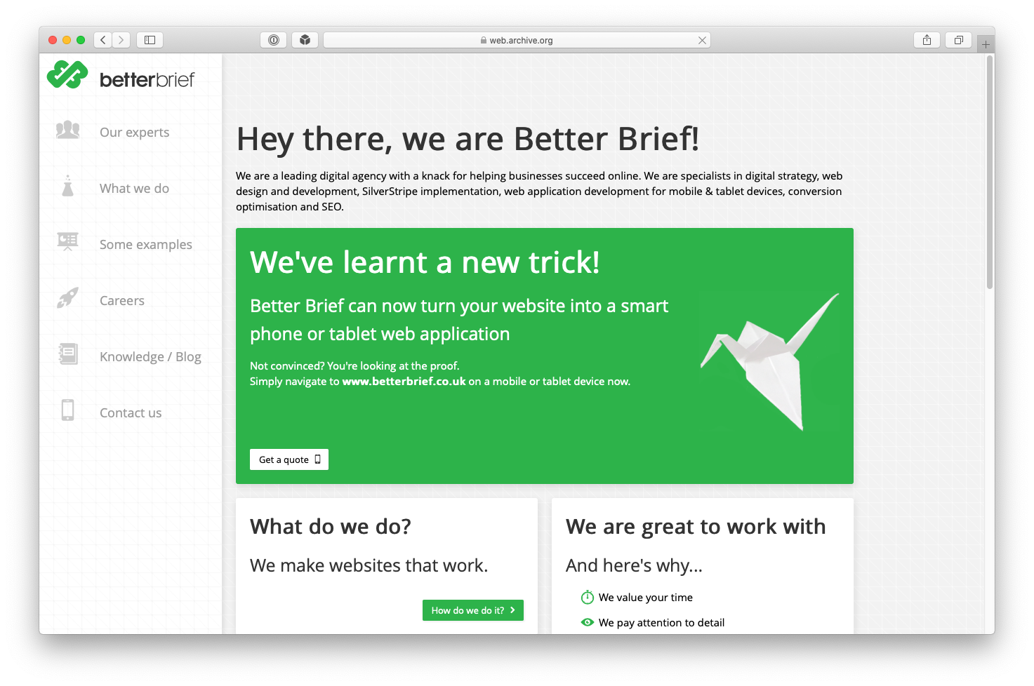 Some of my favourite projects from this time are below. With the web being what it is many of these websites (including the Better Brief site) are now offline or have been redesigned but I captured screenshots from when they were available.